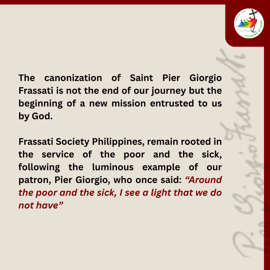 The canonization of Saint Pier Giorgio Frassati is not the end of our journey but the beginning of a new mission entrusted to us by God. As the Frassati Society Philippines, we remain rooted in the service of the poor and the sick, following the luminous example of our patron, Pier Giorgio, who once said: “Around the poor and the sick, I see a light that we do not have”