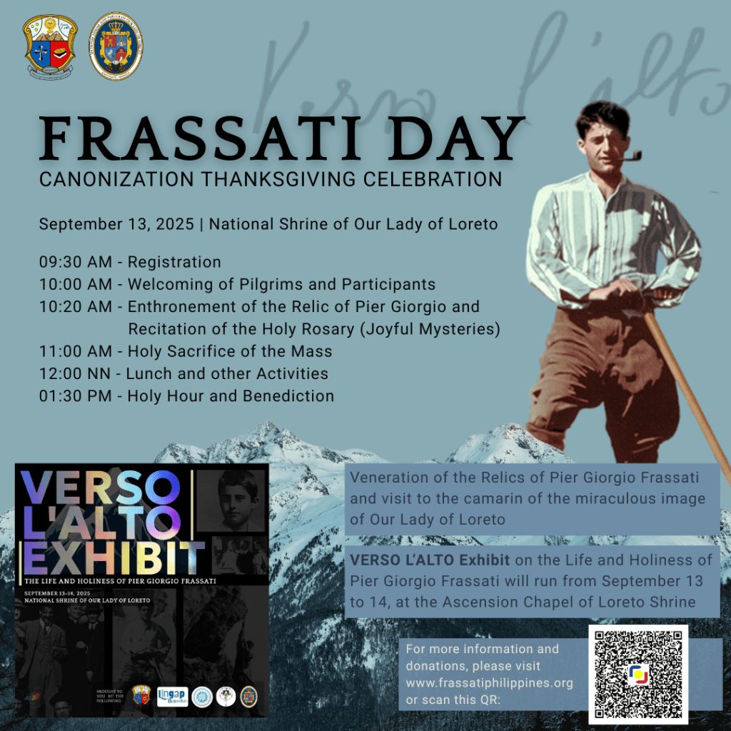 The Frassati Society Philippines is a community walking together on the path of holiness, inspired by the joyful witness of Blessed Pier Giorgio Frassati. Through evangelization, formation, and outreach, we seek to bring Christ to others — especially the poor, the young, and those searching for meaning in life.